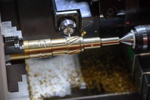 CNC turning is a machining process performed by a lathe to create cylindrical or round parts like shafts and gear blanks. The lathe spins the workpiece and engages a cutting tool to selectively remove material. In a simple 2 axis lathe, the tools remove material to a precise depth and width. 4 and 5 axis lathes or “Mill/Turn” machines use live tooling in the lathe to create features traditionally done in a mill, combining operations, and shortening lead times.